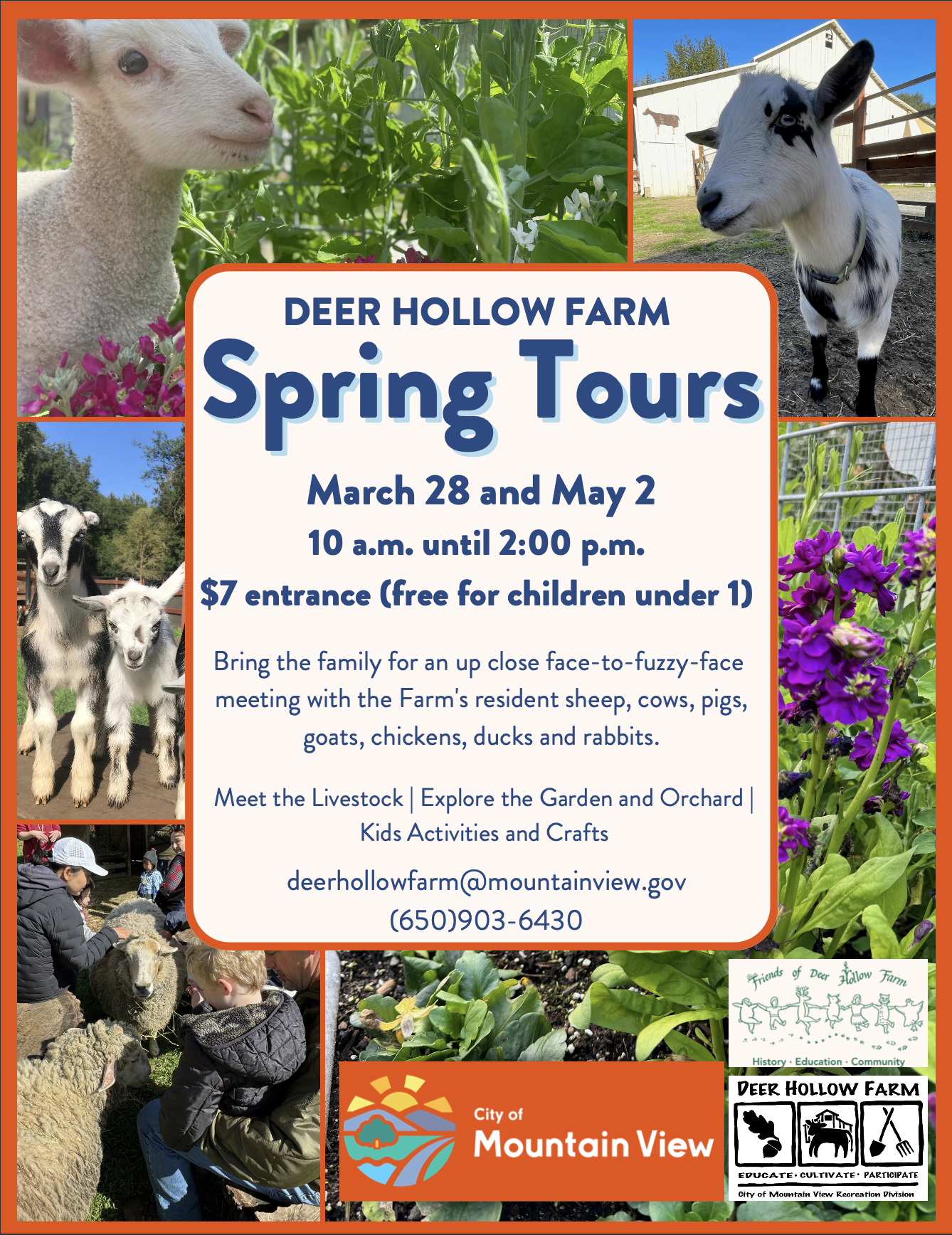 Deer Hollow Farm hosts three fundraising events each year, two Farm Tours in the Spring to celebrate our Spring-born farm animals, and Spooky Times in the Fall to celebrate Halloween. The farm is located in the Rancho San Antonio Open Space Preserve, nestled in the foothills of Los Altos. Google Maps Link here